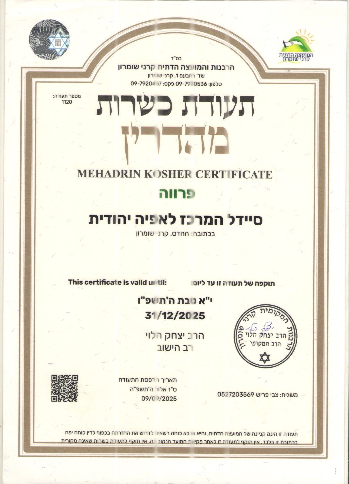The Saidel Jewish Baking Center is Kosher Lemehadrin, Pareve under the supervision of the Karnei Shomron Rabbinate.