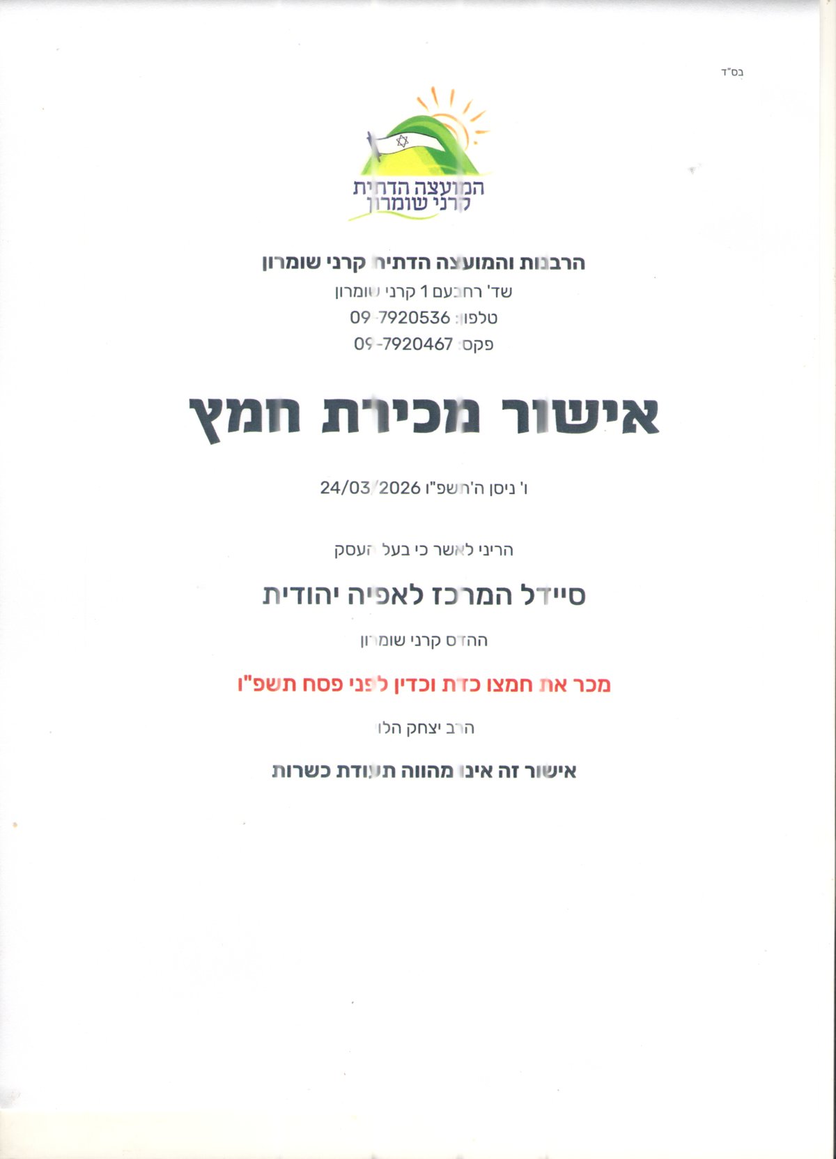 Mashgiach: Tzvi Frish/ Tel: 052-7203569